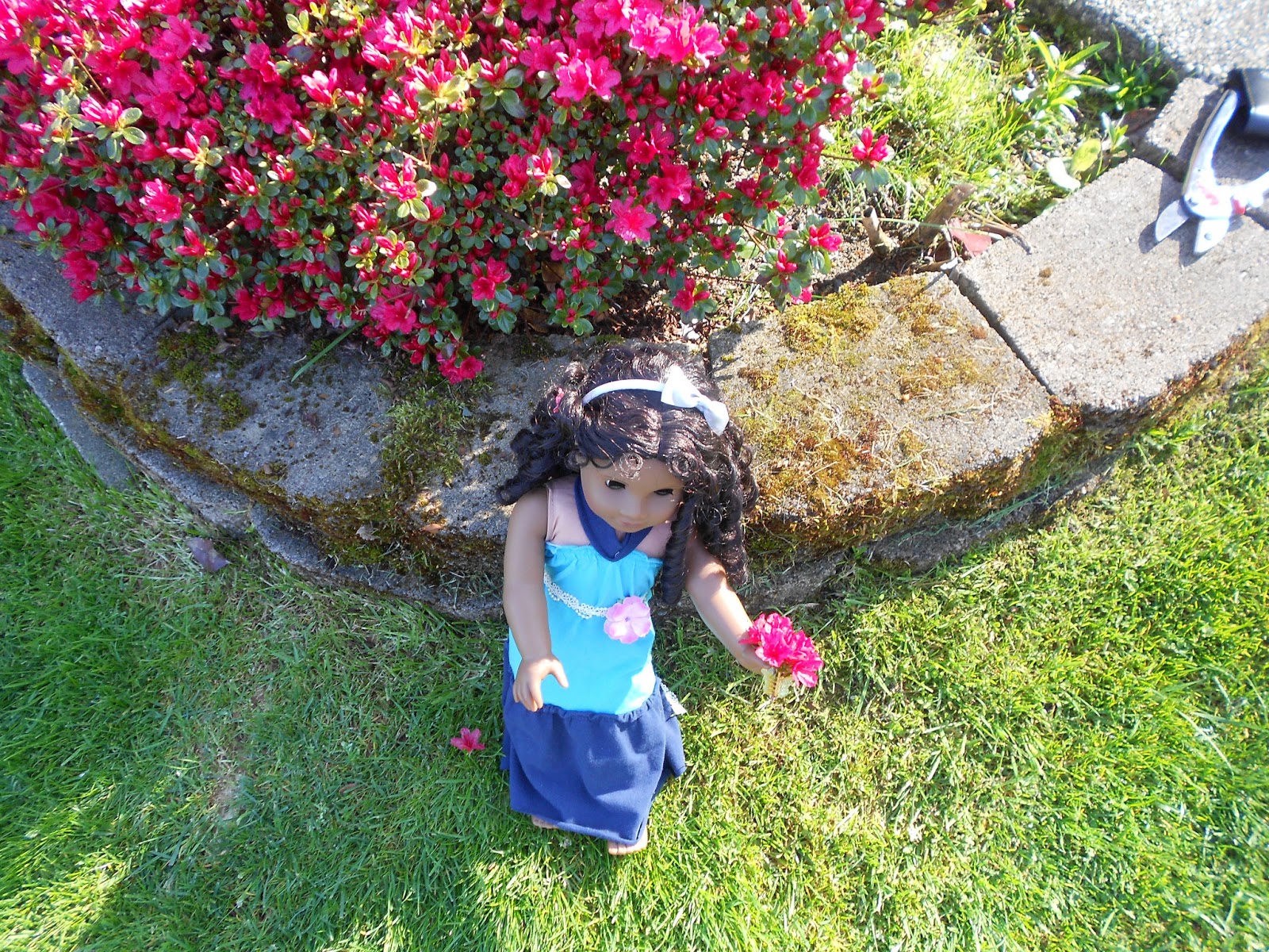 2.) Do interesting scenes, like for this I decided to dress her as a Hawaiian bridesmaid so the Azelia bush in our front yard was perfect!